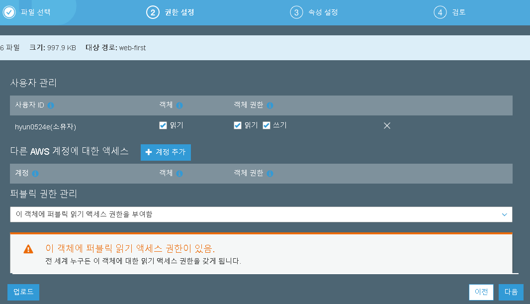 퍼블릭 액세스에 관한 설정은 버킷 내부에서 '권한' 탭으로 가면 있답니다.