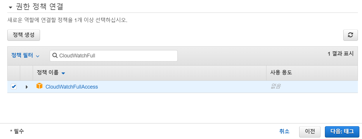 정책 필터에서 CloudWatchFullAccess를 입력해 선택해주고 [다음 : 태그]를 클릭해줄게요.