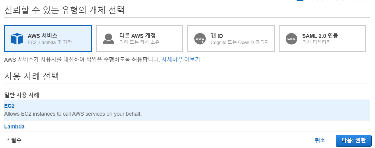 EC2를 선택한 뒤 [다음 : 권한]을 클릭해주세요.
