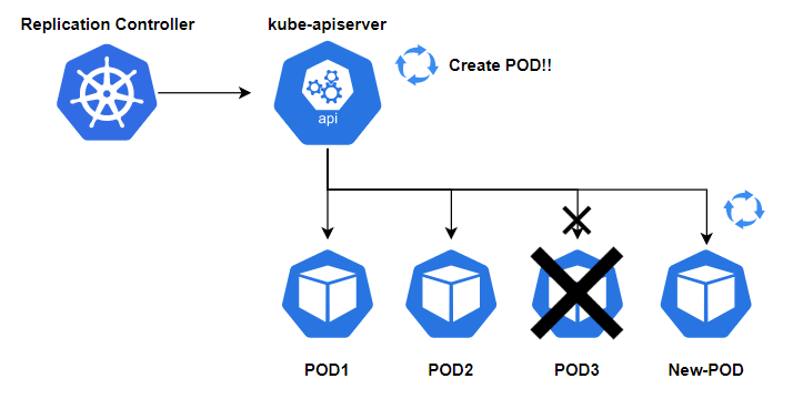 만약 실행 중인 포드가 죽는다면 Replication Controller는 새로운 POD를 생성할 의무가 있어요.