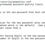 /etc/security/pwquality.conf: Password Policy Configure File /ect/security/pwqaulity.conf - 대/소문자, 숫자, 특수문자를 혼용하여 8글자 이상의 패스워드를 사용- 동일 문자를 연속 4회 이상 사용 금지- 패스워드 히스토리를 관리해 2~3개 이상 동일 패스워드 사용 금지- 패스워드 변경 주기를 설정 (패스워드 유효기간을 90일 이하로 설정)- 사전에 나오는 쉬운 단어나 이름은 패스워드로 사용하지 못하도록 설정- 기본 설정된 패스워드는 사용하지 못하도록 설정- 초기 부여된 패스워드는 사용자 최초 접속시 변경하도록 설정/etc/login.defs: Password Defaults Configure File /etc/login.defs..